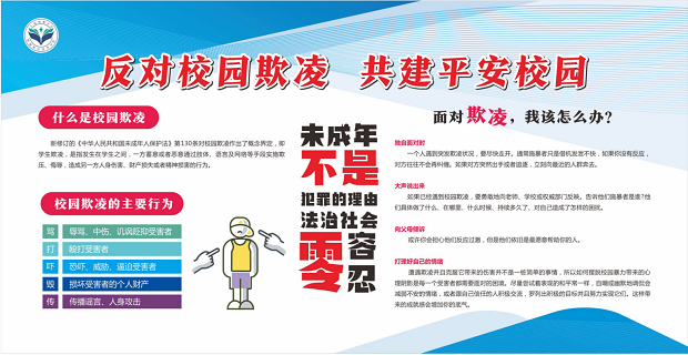 为提高学生防欺凌意识,学校利用宣传栏、显示屏等途径,宣传防欺凌科普知识,形成预防校园欺凌的震慑力,在校园内广泛生动开展预防校园欺凌教育。通过宣传,让防欺凌的相关理念深入人心。