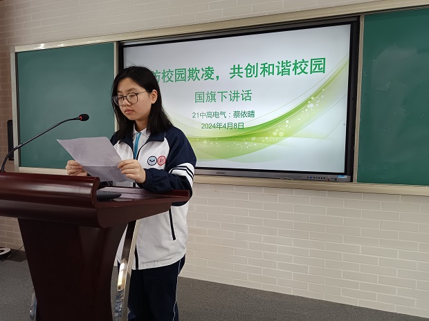 4月22日,“预防校园欺凌,共创和谐校园”主题升旗仪式上,21中高电气班蔡依晴作为学生代表做了主题发言。通过本次发言全体学生深刻认识到校园欺凌的危害,更增强了法制观念。同学之间应该互相包容理解、友好相处,发生矛盾时及时找老师解决,拒绝暴力,增强求助意识。