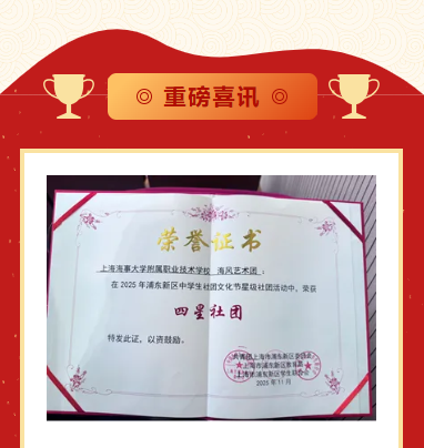 在近日落幕的2025年浦东新区中学生社团文化节星级社团评选中,我校海风艺术社经过严格的线上初审与公开网络投票环节,凭借扎实的社团建设、丰硕的活动成果以及显著的校园文化影响力,荣获“四星社团”称号。